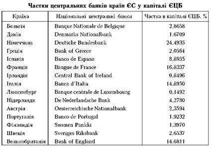 валютного союзу. Квоти країн-учасниць залежать від обсягу ВВП і чисельності населення (табл. 5). Найбільшу частку в капіталі ЄЦБ з країн єврозони має Німеччина (24,5 %), на другому місці з великим відривом стоїть Франція (16,8 %). Найменша квота припадає на Фінляндію (1,4 %), Ірландію (0,85 %) і Люксембург (0,15 %).