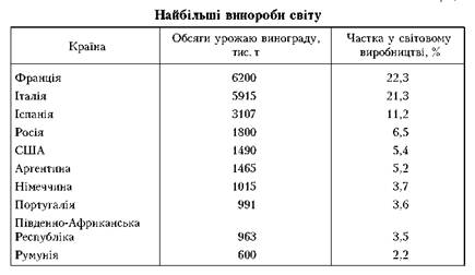 Ниноградарстео. Людина вивела понад 4 тис. (за іншими даними — 8 тис.) сортів винограду. Людство вирощує виноград з різною метою — для споживання свіжим, виробництва оцту, соків, вина тощо. Певне уявлення про найбільших виноробів світу дають дані, наведені в табл. 10.