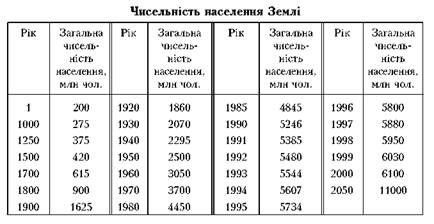 У табл. 1 наведено дані про збільшення чисельності населення Землі від появи людини до наших часів, а також прогноз чисельності населення планети у 2050 р.