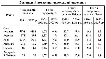Найвищими темпами збільшується населення Африки - щоро-ку на 3 %. Кенійська жінка у середньому народжує 7 разів. “Демо-графічному вибуху” сприяють не лише високі темпи народжуваності, а й загальмовані темпи смертності населення планети. Очікується, що у 2025 р. чисельність населення становитиме 8,5 млрд чол.(табл. 2).