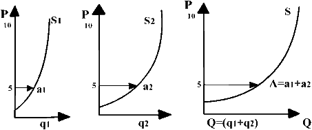 Ринкова крива пропозиції (S) складається з кривих індивідуальних пропозицій і може бути накреслена аналогічно кривій ринкового попиту (D).
