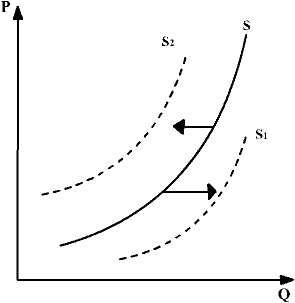 Переміщення кривої пропозиції (S) вправо означає збільшення пропозиції (S1), переміщення кривої пропозиції вліво означає її зменшення (S1).