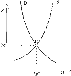 С - точка перетину кривої Q і кривої S, яка визначає рівноважну ціну (Рc) та рівноважний обсяг попиту та пропозиції (Qc).