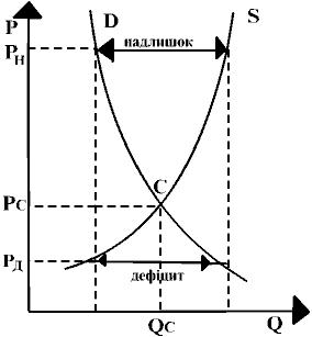 PH, Pд — ціни, при яких встановлюється дефіцит та надлишок.
