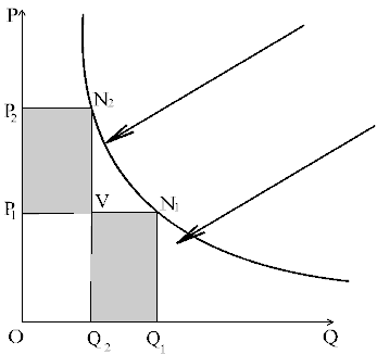 На рис. 4.3 показано виграш продавця від збільшення ціни на товар та його програш від спричиненого цим зростанням ціни зменшення обсягу продажу. Якщо площа фігури Р1P2N2V (виграш від зростання цін) більша, ніж площа фігури Q2Q1N1V (програш від зменшення обсягу продажу), то загальні доходи продавця зростуть. Якщо більшою є площа фігури Q2Q1N1V, то при зростанні ціни загальні доходи продавця зменшаться. Результат залежатиме від еластичності попиту за ціною: при |Ed| > 1 — продавець програє; при |Ed| < 1 — виграє.