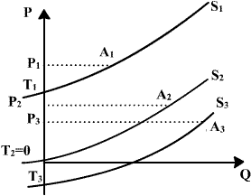 Оскільки ОР2=Р2Т2, то ЕS>1. Отже, пропозиція одинично-еластична як у точцці А2, так і в бьудь-якій точці кривої S2.