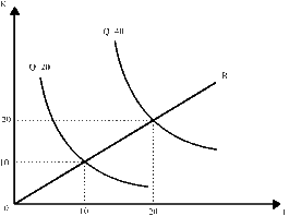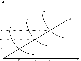 На рисунку вздовж променя ОR праця і капітал витрачаються у пропорції К:L= 1:3. При 10 одиницях капіталу і 10 одиницях праці випуск продукції становить 20 одиниць. Коли обсяг випуску збільшується у пропорції, яка перевищує пропорцію збільшення вхідних факторів, має місце зростаючий ефект масштабу Тут після подвоєння кількості вхідних факторів випуск продукції збільшився більше як удвоє (90: 20 = 4,5).