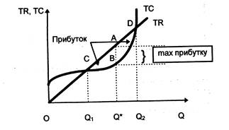 Передбачається, що фірма враховує зміни величини витрат у процесі випуску продукції і вибирає той його обсяг, який дасть максимум прибутку, що і буде відповідати максимальній різниці (ТR— ТС),