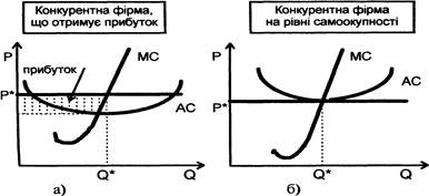 Для конкурентної фірми, що отримуєприбуток (графік 1.8,а) ринкова ціна (Р) на продукцію фірми більша, ніж середні витрати на її виробництво АС при