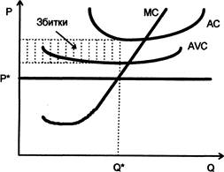ринкова ціна (Р) нижча за мінімально можливі середні витрати (АС) при обсязі випуску продукції Q* (АС>Р)\ фірма не покриває свої витрати на виробництво продукції і несе збитки.