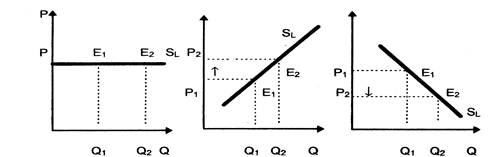 SL — крива пропозиції в галузях з незмінними, зростаючими та спадними витратами в довгостроковому періоді. Конфігурація довгострокової кривої пропозиції галузі залежить від рівня довгострокових середніх витрат (LАС), які впливають на рівень ціни (Р), збільшуючи її (Р1 -> Рг) (графік 1.13,6)