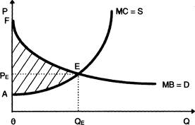 При ефективному випускуQEплоща АFЕ відображає максимально можливу вигоду споживача та виробника. В досконало конкурентній економіці дії виробників, що прагнуть прибутку, приведуть до такого розподілу ресурсів,