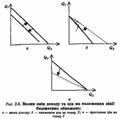 Зміна доходу та цін на товари змінює положення лінії бюджетного обмеження. Якщо змінюється доход, то крива пересувається вправо (збільшення доходу) чи вліво (зменшення доходу). При цьому кут нахилу лінії залишається незмінним. Навпаки, якщо змінюється ціна на продукт, то це призводить до зміни кута нахилу лінії: він збільшується при зростанні цін на товар X та зниженні цін на товар Y і зменшується, якщо на ринку складається протилежна ситуація (рис. 2.6).