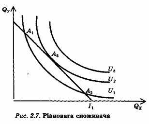 Рівновага споживача відповідає такій комбінації придбаних товарів, яка максимізує корисність при; заданому бюджетному обмеженні. Як тільки спожи- вач отримує такий набір, у нього зникають стимули) замінювати його на інший.