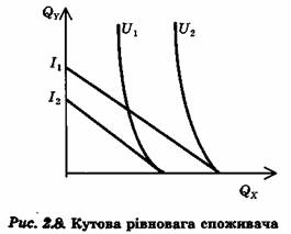 Рівновага споживача, при якій він придбає обидва товари, називається внутрішньою. Однак може статися, що споживач буде максимізувати свою корисність, зупинившись на придбанні лише одного товару. Така рівновага називається кутовою. Наприклад, хтось із студентів вирішив обмежити споживання борошняних виробів, тоді кут нахилу кривої байдужості значно зросте, і в жодному місці лінія бюджетних обмежень не зможе бути дотичною. Рівновага буде досягатися в точці, яка відповідає максимально можливій кількості котлет, що може придбати студент залежно від його бюджета (рис. 2.8).