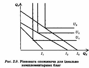розглядати додаткове споживання як таке, що прино-сить йому користь, називається точкою насичення. Треба звернути особливу увагу на споживання то-арів, що ідеально доповнюють один одного, тобто, коли ефективне споживання одного товару без певної кількості іншого взагалі неможливе (автомобілі та номерні знаки, черевики та шнурки до них тощо). У цьому випадку ні зміна співвідношення цін, ні доход споживача не впливатимуть на співвідношення цих товарів у наборі, який обирає споживач (рис. 2.9).