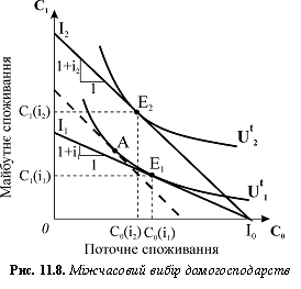 Оптимальний вибір досягається в точці дотику міжчасової бюджетної лінії та кривої байдужості (рис. 11.8), де майбутня цінність однієї заощадженої гривні згідно уподобань індивіда , збігається з майбутньою ринковою цінністю заощадженої гривні за існуючої процентної ставки: .