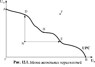 Межа можливих корисностей – модель економіки з двома економічними суб’єктами, які розподіляють між собою обмежений обсяг благ (рис. 12.1), – ілюструє множину комбінацій рівнів корисностей, які можуть бути досягнуті учасниками обміну. Всі точки відповідають Парето-ефективним розподілам. Проте різні варіанти розподілу добробуту суттєво відрізняються з точки зору справедливості.