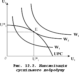 Максимізація функції суспільного добробуту у відповідній графічній моделі (рис. 12.2) передбачає суміщення кривих рівного добробуту або суспільних кривих байдужості з межею можливих корисностей , що дозволяє визначити точку рівноваги. Будь-який інший стан на межі можливих корисностей неоптимальний щодо суспільного добробуту, хоча є Парето-оптимальним. У точці рівноваги забезпечується максимальний рівень добробуту економічних суб’єктів, проте такий розподіл – лише один з можливих варіантів справедливого розподілу.