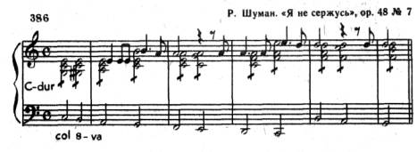 Зразок вільнішого застосування побічних септакордів (як в попередньому прикладі, так і в подальшому можна прослідити секвентність, проведену не цілком строго) ми даємо в цитаті з романсу Р. Шумана «Я не серджуся»: