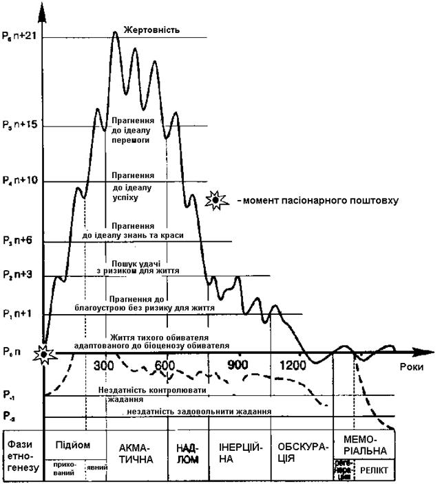Пасіонарна напруженість й напрямок її зміни визначають фазу етногенезу. Етнос у своєму розвитку проходить 5 фаз: підйом, акматичну, надлом, інерційна, обскурація, релікт. По осі абсцис відкладений час у літах, де вихідна точка кривої відповідає моменту пасіонарного поштовху, що послужив причиною появи етносу.