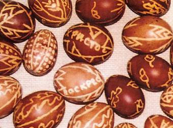 «Яйця фарбують здебільшого в червоний колір, бо це нагадує про кров Спасителя. Вживають суху траву «серпій», варять її, а потім кидають у навар яйця: він фарбує їх у жовтий колір. Лушпиння з свячених яєць зберігають на підкурювання людей і худоби проти пропасниці. Селяни вірять, що в свяченому яйці є сорок милостинь і що в ньому перебуває "Дух святий".»