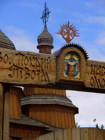 Церковна брама з хрестом "Сонце Правди" з образом "Покрови Пресвятої Богородиці". Художник Олександр Цугорка