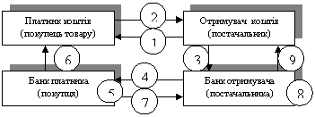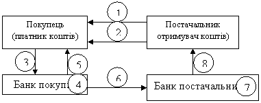 1 — постачальник відваїггажує продукцію покупцеві, 2 — разом з документами на відвантажену продукцію постачальник передає платіжну вимогу-доручення на оплату; 3 — покупець передає платіжну вимогу-доручення в банк, який його обслуговує. для переказу коштів; 4 — банк покупця (платника коштів) списус з рахунка покупця кошти; 5 — банк покупця сповіщає випискою покупця — власника рахунка про списання коштів -з його розрахункового рахунка; 6 — банк покупим направляє в банк постачальника платіжну вимогу-доручення; 7 — банк постачальника зараховує коні 111 на рахунок постачальника (отримувача коштів); 8 — банк постачальника сповіщає постачальника (в 1.1 сника рахунка) про надходження коштів на рахунок (випискою з розрахункового рахунка).