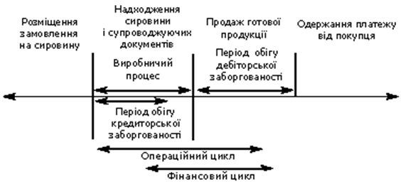 Операційний цикл характеризує загальний час, протягом якого фінансові ресурси заморожені в запасах і дебіторській заборгованості. Оскільки підприємство оплачує рахунки постачальників із тимчасовою відстрочкою, то час, протягом якого кошти вилучені з обігу, тобто фінансовий цикл, менше операційного на середній час обігу кредиторської заборгованості. Скорочення операційного й фінансового циклів розглядається як позитивна тенденція. Якщо скорочення операційного циклу може бути досягнуте за рахунок прискорення виробничого процесу й оборотності дебіторської заборгованості, то фінансовий цикл може бути скорочений як за рахунок даних факторів, так і за рахунок деякого уповільнення оборотності кредиторської заборгованості.
