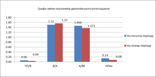 Висновок: рівень рентабельності власного капіталу зменшився на 43,86 % або на 0,061 одиниць. Для підприємства це спадання є негативним результатом, тому що рентабельність власного капіталу вважається найважливішим підсумковим показником, тут фокусуються всі результати всіх напрямків діяльності підприємства, в даному варіанті функціонування підприємства показники мають негативну тенденцію, тобто тенденцію до зменшення. З вищенаведених розрахунків можна дізнатися як впливають деякі чинники на зміну прибутковості власного капіталу. Найбільш вплинув показник рентабельності реалізованої продукції за чистим прибутком і складає 0,059 в абсолютному відношенні та 96,42% в відносному. Його зміна на 42,29 % спричинила зменшення НПвк на 0,059.Аналізуючи складові дюпонівського розкладання слід відзначити, що показник рентабельності зменшився на 0,02 пункти, що в порівнянні з відносно невеликою рентабельністю взагалі за попередній період, складає зменшення на 42,29 % . Оборотність збільшується на 3,87 %, що свідчить про позитивну тенденцію, але це не є визначальним показником, так як величина показника не велика і не є визначальною. Коефіцієнт заборгованості зменшився на 3,87 %, що є позитивним для підприємства так, як залежність від зовнішніх джерел зменшується. Також необхідно зазначити що кредит взятий підприємством є невигідним і має негативний вплив на загальну картина, так як відсоток під який ми залучаємо кошти на підприємство дорівнюють 20 %, тобто з кожних 100 одиниць отриманого маємо повернути 20 одиниць (з 1 гривні потрібно повернути 20 копійок). На підприємстві норма прибутку складає 0,14 та 0,08 за попередній та звітній період відповідно, тобто 1 грн. приносить 14 та 8 копійок, а повертати потрібно 20 коп. Отож, кредит є невигідним так як ставка зависока. Ці зміни наглядно можна зобразити на графіку: