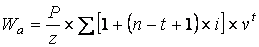 де Р – ціна товару (якщо умови операції передбачають сплату авансу, то останній вираховується з ціни і далі не береться до уваги; інакше кажучи, під Р розуміємо ціну за мінусом авансу); п – кількість векселів; і – ставка простих відсотків за період, під яку проводиться кредитування; t – період; v – дисконтний множник за ринковою відсотковою ставкою; z – коефіцієнт коригування. |