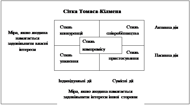 Якщо представити це у графічній формі, можна отримати сітку Томаса-Кілмена, що дозволяє визначити місце та назву для кожного з п’яти основних стилів вирішення конфлікту.