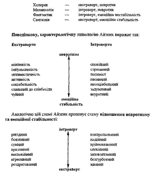 У працях 1964 — 1965 років Айзенк, підсумовуючи свої розвідки, пропонує чотири типи особистості, що насправді є типами темпераменту, пов'язуючи їх з протиставленнями: екстраверт — інтроверт, невротизм — емоційна стабільність. Його схема має такий вигляд: