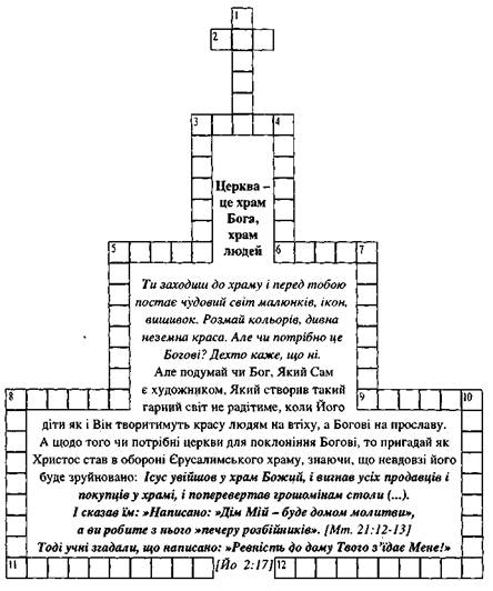 (Замість цифр простав перші літери відгаданих слів і прочитай гасло). 1 - найважливіша книга людства, яку писали сотні років, десятки авторів і в якій міститься Слово Боже; 2 - символ євангеліста Івана; 3 - підвищення, на якому в старозавітних релігіях забивали і спалювали тварину чи її частину як дар Богові; 4 -назва саду в який Господь помістив першу людську пару; 5 - священний день у євреїв; 6 - період, в який Церква вказує стримуватися від певних страв і гучних забав; 7 -апостол, який за легендою встановив хрест на Київських горах; 8 - митрополит, наступник А.Шептицького, який довгі роки перебував у радянських тюрмах і концтаборах за християнську віру; 9 - приятель Ісуса, якого Спаситель воскресив після 4 денного перебування у гробі; 10 - одна з книг Біблії в якій написано історію виникнення і поширення Христової Церкви; 11 - місто, по дорозі до якого Ісус після воскресіння відкрився своїм учням; 12 - старозавітна грошова одиниця, яка згадується в притчі про пана і двох сумлінних та одного лінивого слугу; 13 - молитва, в якій ми визнаємо основні правди нашої віри; 14 - тварина, на якій Ісус Христос в'їхав до Єрусалиму; 15 - акт, яким новонароджені діти чи нехристияни прилучаються до Церкви Христової.