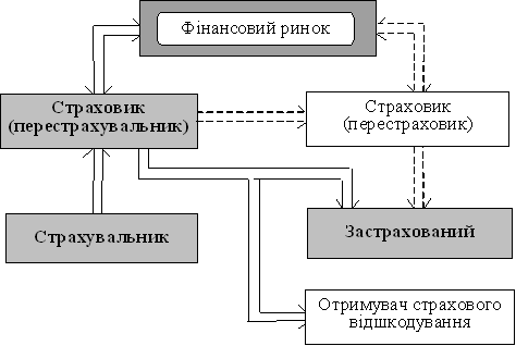 Страхові відносини характеризуються рухом грошових потоків, зображених на схемі 17 (пунктирними лініями зображено відносини перестрахування):