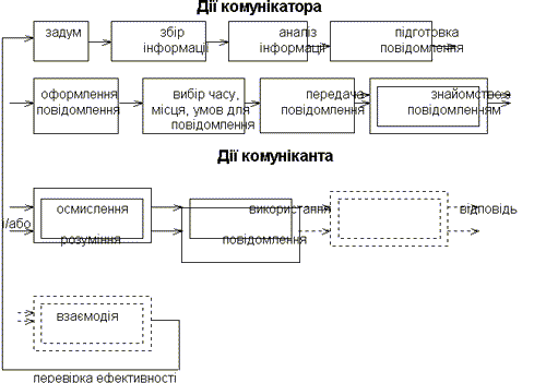 1. Джерело інформації. 2. Комунікатор. 3. Повідомлення 4. Комунікант. 5. Комунікаційний канал. 6. Екстралінгвістичний параметр повідомлення. 7. Джерело механічних перешкод. 8. Джерело семантичних перешкод. 9. Класові і соціальні фільтри. 10. Особистісно-індивідуальні фільтри. 11. Семантичні поля. 12. Поля комунікаційної обстановки. 13. Втрата інформації. 14. Зворотний зв'язок "комунікант — комунікатор". 15. Зворотний зв'язок "комунікант — джерело інформації". Комунікативний процес відбувається у вигляді ланцюга послідовних дій, які можна представити у такій схемі: