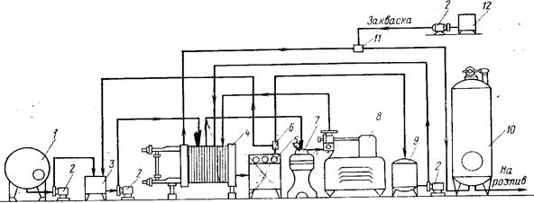 Мал. 45. Схема технологічної лінії виробництва кисломолочних напоїв резервуарним способом: