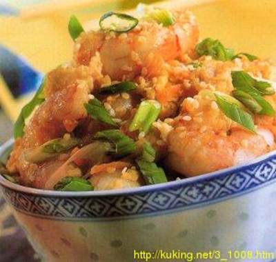 3. Викласти креветки fu yong на підігріту тарілку, посипати зеленою цибулею, кунжутними насіннячками і побризкати кунжутною олією. Подавати негайно.
