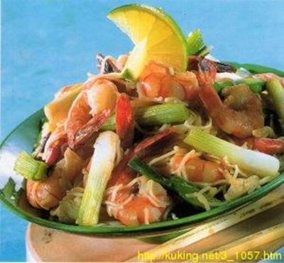 2. Розжарити арахісову олію у сковороді “вок”, обсмажити часник і бадьян протягом 30 сек. Додати зелену цибулю і креветки, обсмажувати ще 2-3 хв. Додати соєвий соус, сік лайми і локшину. Перемішати.