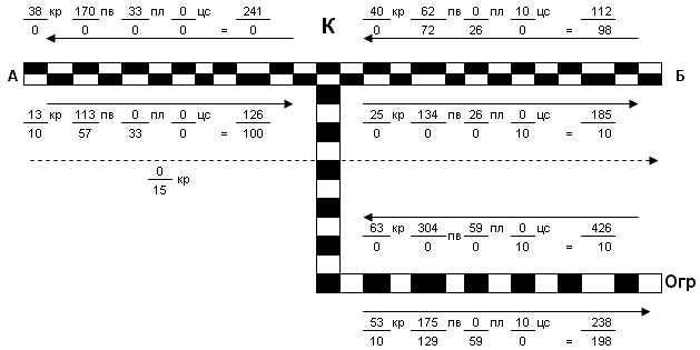 Рисунок 5.1 Схема завантаження і порожніх вагонопотоків по станції Ов та напрямкам А-К і К-Б
