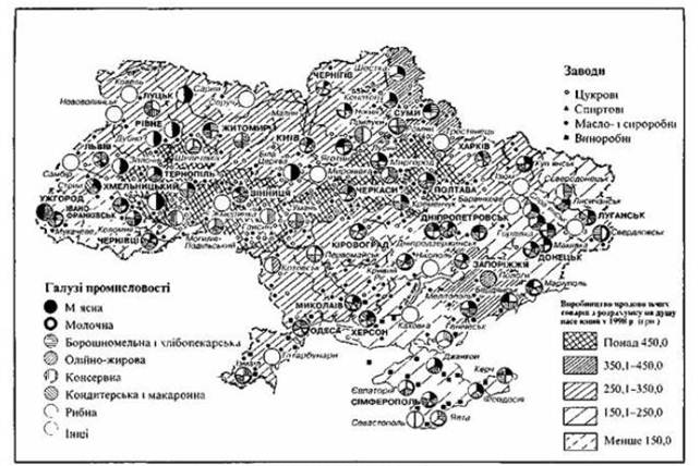 Харчова промисловість є основною переробною ланкою АПК (рис. 1). її галузі - м'ясна, молочна, цукрова, борошномельно-круп'яна, консервна, олійна і крохмале-патокова Основними чинниками розміщення галузей є чисельність і густота населення, сировинна база, форми організації виробництва, транспорт, об'єктивними - природні умови та науково-технічний прогрес. За дією основних чинників галузі харчової промисловості поділяють на такі, що орієнтуються: