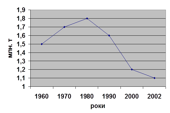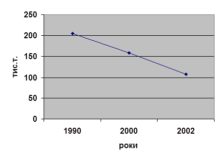 Аналізуючи графік можна зробити висновок, що посівні площі за період 1990 – 2002 років зменшуються, хоча в світі зростають.
