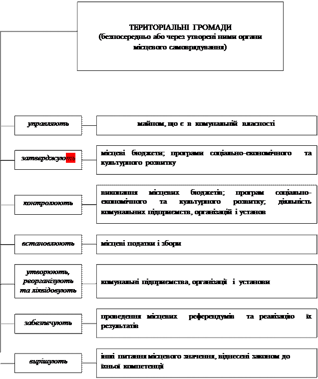 - соціально-економічний та культурний розвиток території; - місцевий бюджет, місцеві податки та збори; - місцеві референдуми; - управління комунальним майном; - утворення підприємств комунальної власності; - затвердження статуту територіальної громади та її символіки; - муніципальна міліція; - утримання об’єктів житлово-комунального господарства, розвиток місцевої інфраструктури; - будівництво, ремонт комунального житла та інших приміщень комунальної власності; - утримання соціально-культурних закладів комунальної власності; - побутове, торгівельне обслуговування, громадське харчування; - місцевий пасажирський транспорт; - збирання, транспортування, утилізація та знешкодження сміття; - шляхи місцевого значення; - кладовища; - місцева пожежна охорона; - ритуальні послуги; - повна загальна середня освіта; - підвезення школярів; - медичне обслуговування у закладах освіти, культури, фізкультури і спорту, оздоровчих закладах комунальної власності; - охорона довкілля; - земельний податок, плата за користування природними ресурсами; - встановлення додаткових гарантій щодо соціального захисту населення; - найменування вулиць, площ, проспектів тощо. |