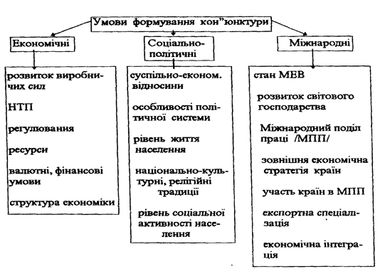 У процесі взаємодії різноманітних факторів розвитку на світових товарних ринках формується відповідна ринкова кон’юнктура, яка відбиває зміни конкретних умов функціонування ринку та співвідношення попиту і пропозиції, пов’язаних з динамікою цін на товари та прибутками фірм (схема 5).