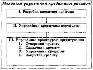 Механізм управління кредитним ризиком (рис. 19.2) полягає в розробці та реалізації кредитної політики, визначенні основних параметрів кредитного портфеля та управлінні ним, а також в управлінні процедурою кредитування.