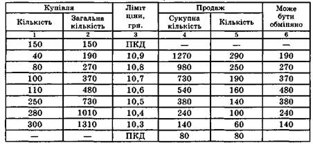 У гр. 3 табл. 18.3 наведено обмежувальні ціни (ліміти цін) на купівлю-продаж цінного папера. У гр. 1 — кількість цінних паперів у заявках на купівлю цінних паперів за обмежувальним курсом, наведеним у гр. З, в гр. 2 — загальна кількість цінних паперів, які можуть бути придбані за ціною, не більшою, ніж наведено в гр. 3. У гр. 4 подана сукупна кількість цінних паперів, які можуть бути продані за ціною, не нижчою відповідної обмежувальної ціни, в гр. 5 — кількість цінних паперів у заявках на продаж за відповідним обмежувальним курсом, у гр. 6 — загальна кількість цінних паперів, які можуть бути куплені-продані при відповідній обмежувальній ціні. Так, за обмежувальним курсом 10,8 грн. бажають купити 80 цінних паперів і продати 250. При цьому загальна кількість цінних паперів, які можуть бути куплені за ціною 10,8 грн., становить 270 шт., оскільки є заявки на купівлю 150 цінних паперів за курсом дня і 40 цінних паперів за курсом, не вищим як 10,9 грн. Загальна кількість цінних паперів, які можуть бути продані за ціною, не меншою 10,8 грн., дорівнює 480 шт. При обмежувальній ціні 10,8 грн. може бути обміняно (куплено-продано) 270 цінних паперів.