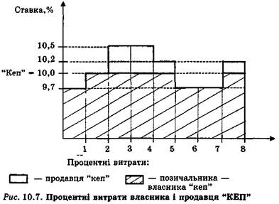 Процентні витрати позичальника — власника опціону "кеп" та продавця "кеп" подано на рис. 10.7.