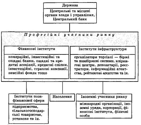 Структуру фінансового ринку подано на рис. 1.1. Основними суб'єктами ринку виступають інститути позафінансової сфери, держава, населення, професійні учасники ринку — фінансові інститути та інститути інфраструктури, а також іноземні учасники ринку.
