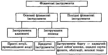 Існує дві основні категорії фінансових інструментів, які суттєво відрізняються надійністю щодо отримання доходу — інструменти позики (облігації, векселі, казначейські зобов'язання тощо) та інструменти власності (акції) (рис. 2.1).
