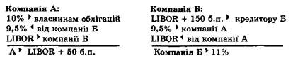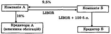 Компанії приймають рішення укласти угоду своп про обмін процентними ставками, згідно з якою компанія А буде виплачувати компанії Б (а та згодом своєму кредитору) плаваючу процентну ставку LIBOR, а компанія Б буде сплачувати А фіксовану процентну ставку 9,5%.